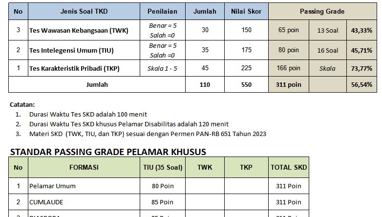 Adapun nilai ambang batas di atas ditujukan untuk pelamar kategori umum, untuk pelamar khusus, passing grade SKD 2023 adalah:
