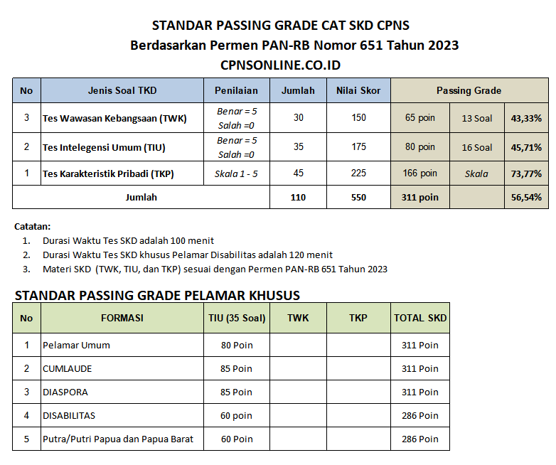 Nilai Ambang Batas atau Passing Grade SKD CPNS 2023 Pelamar Khusus.